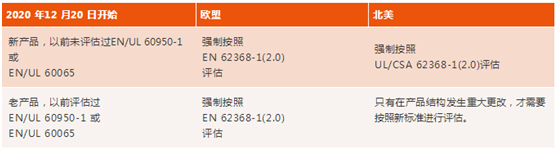 根據(jù) 2018 年 6 月 15 日發(fā)布的 OJ 公告, 強制實施日期為 2020 年 12 月 20 日, 強制實施的概念是從這天起, 所有要進入歐盟的相關(guān)產(chǎn)品都要評估符合 EN 62368-1(2.0), 包括那些之前用 EN 60950-1 或 EN 60065 評估的產(chǎn)品也必須按照 EN62368-1(2.0)重新評估。