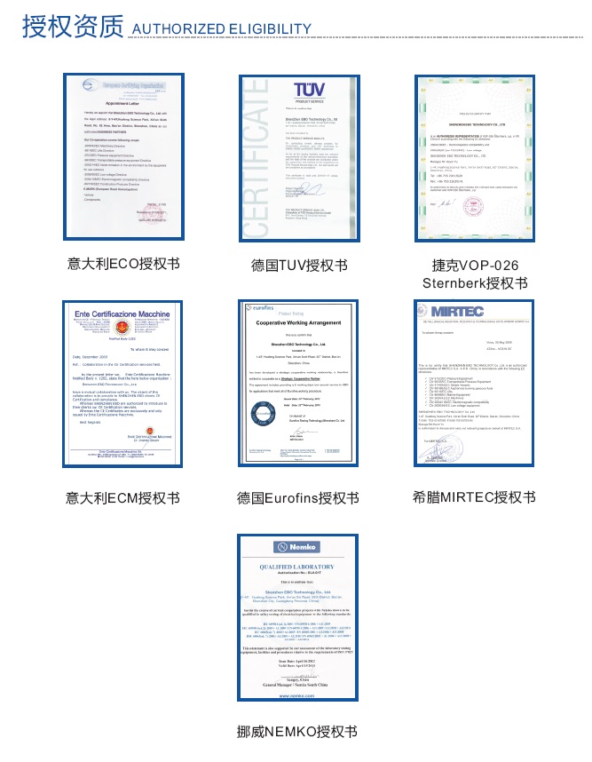 EBO已獲得眾多國際認證機構(gòu)的認可,是德國TUV、EMCC, 美國UL、FCC、TIMCO,加拿大IC、捷克EZU,意大利ECO、ECM,挪威NEMKO等國際權(quán)威機構(gòu)授權(quán)合作的實驗室,檢測報告具有國際公信力。EBO可直接進行歐盟CE認證、美國FCC認證、CCC、C-Tick、SAA、MEPS、ETL、UL、E-MARK、FDA、RoHS、REACH、VCCI、PSE等認證的全部測試,協(xié)助客戶一次申請獲得多國的認證證書。產(chǎn)品范圍包括信息技術(shù)類、家電類、燈具類、電動工具類、廣播電視音響類、工業(yè)、科學(xué)、醫(yī)療類,汽車電子、無線射頻產(chǎn)品、機械設(shè)備、建材、家具、體育運動器械等。