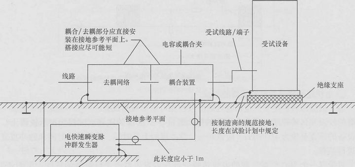 試驗配置包括接地參考平面、耦合裝置〔網(wǎng)絡(luò)或耦合夾〉、去耦網(wǎng)絡(luò)、試驗發(fā)射器等,